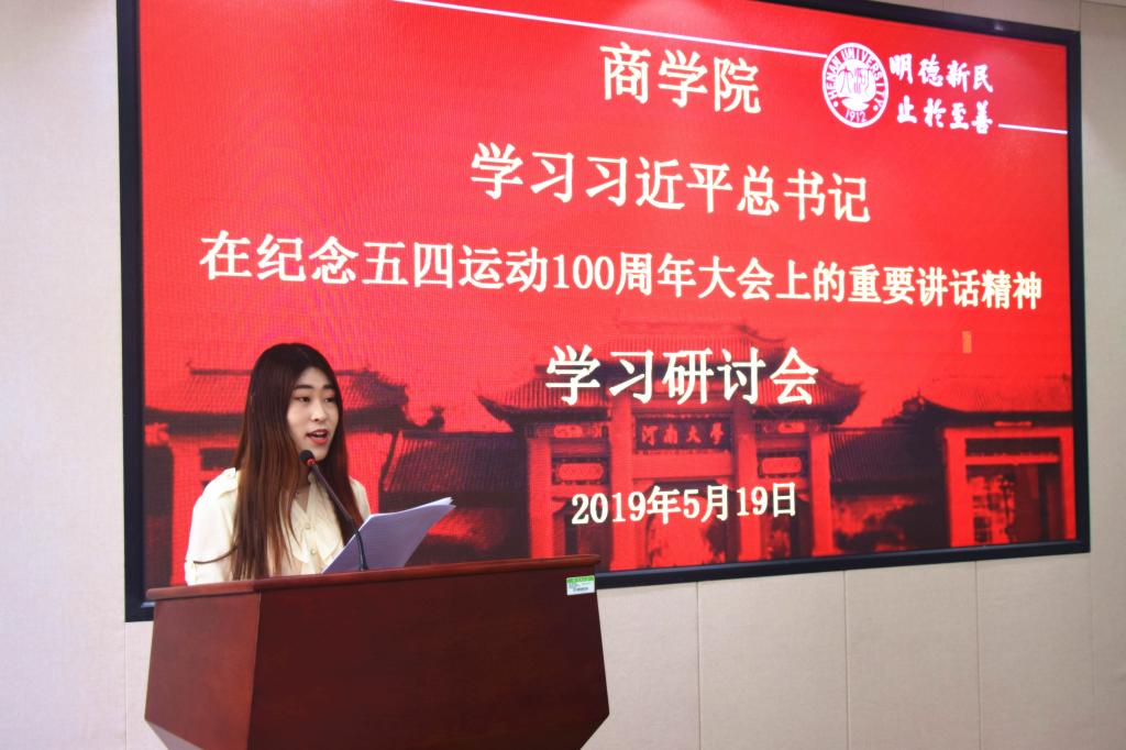 会议伊始,金英焕介绍活动详情、活动流程及活动目的。随后,由团委副书记(员工)老员工艺术团团长房燕简要介绍习近平总书记在纪念五四运动100周年大会的重要讲话精神。紧接着,2018级员工代表陈宇航进行讨论发言,他号召青年人要担当起时代使命,要勇渔做走在时代前列的奋进者、开拓者和奉献者。最后,研讨会在主持人的总结语中圆满结束。