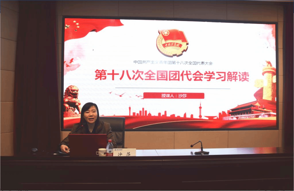 沙莎以《第十八次全国团代会学习解读》为主题,从会议概括、中央致辞、报告解读、修改团章等四个方面向学员们进行了精彩阐释。首先,沙莎从大会的背景和主题出发,阐述了在全面贯彻党的十九大精神的时代背景下,举行团十八大的必要性和重要意义。随后,在解读党中央致辞时,她表示,希望广大青年团员能够积极响应习近平总书记的号召,始终坚定理想信念,着力锤炼高尚品格,不断增长能力才干,永远保持奋斗精神,勇于投身创新创造。最后她又用自己的求学经历现身说法,说明提高思辨能力、创新能力的重要性,并强调青年团员要保持思想的先进性和纯洁性,不忘跟党初心,牢记青春使命。