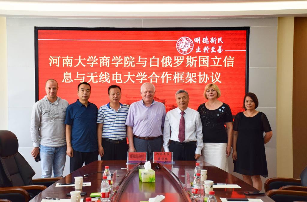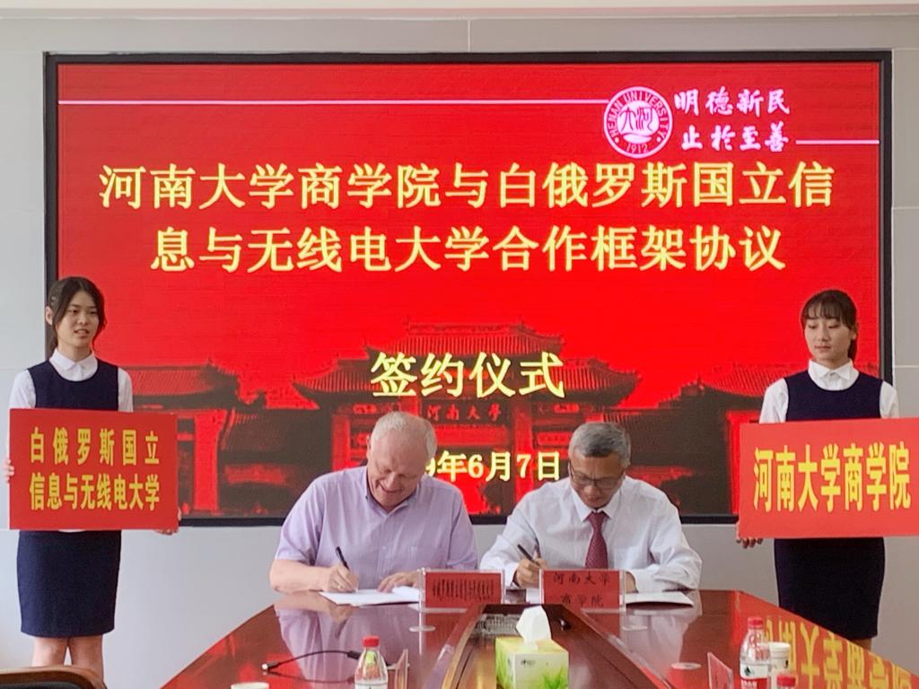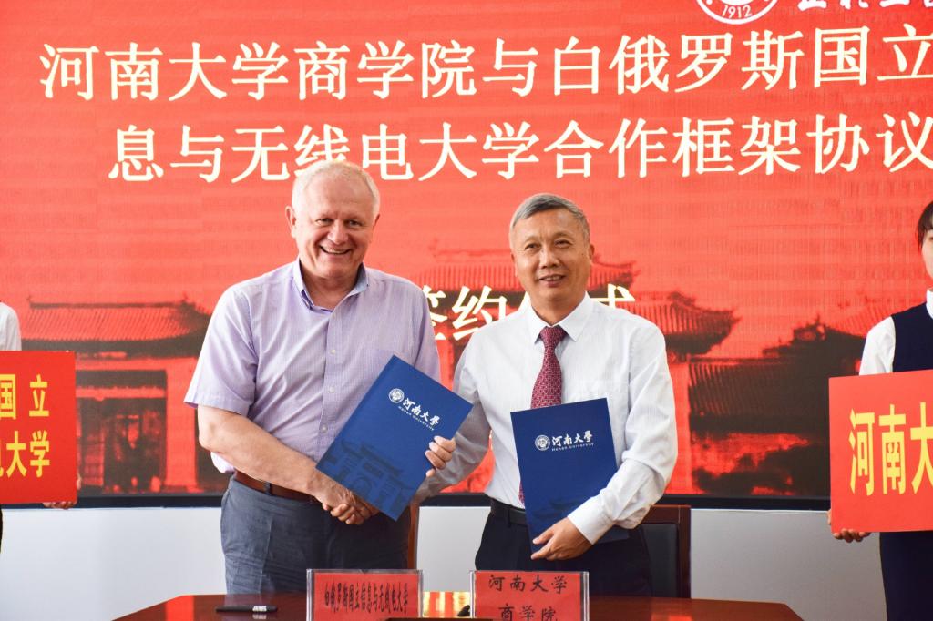 After the talks, Wang Xingyu and Jik Sergei jointly signed the framework agreement on cooperation between the Business School of Henan University and the national information and Radio University of Belarus. The two sides jointly said that in the next stage, they should further deepen the consensus, implement the cooperation and exchange effectively, and jointly create a successful example of university cooperation and collaborative development.