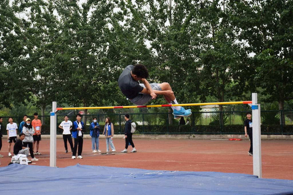 跳高场地上,18级财务管理班范皓钦在助跑后,纵身一跃,身体在空中划出一道弧线,随后迅速沉身、收脚,凭借完美的跳高技巧在男子甲组跳高比赛中勇夺桂冠!