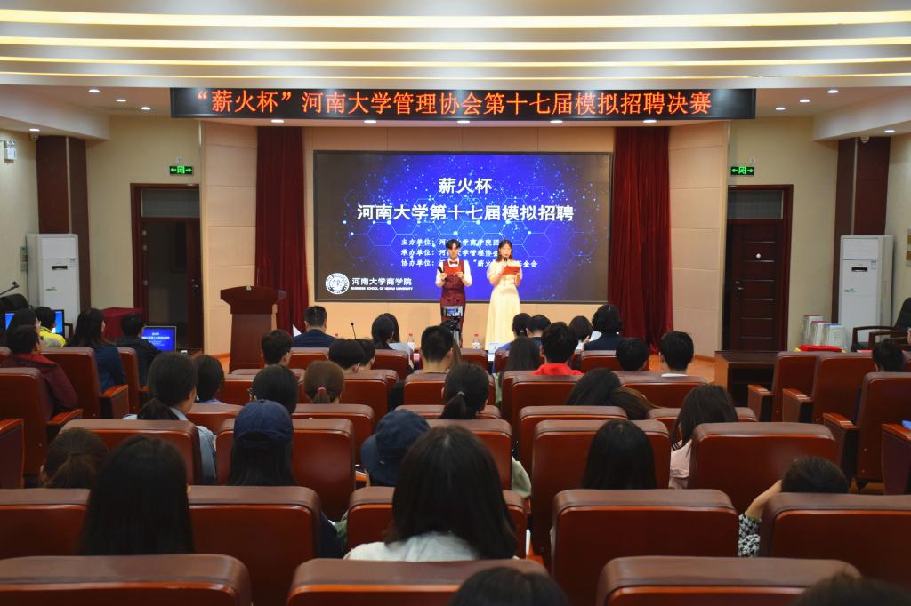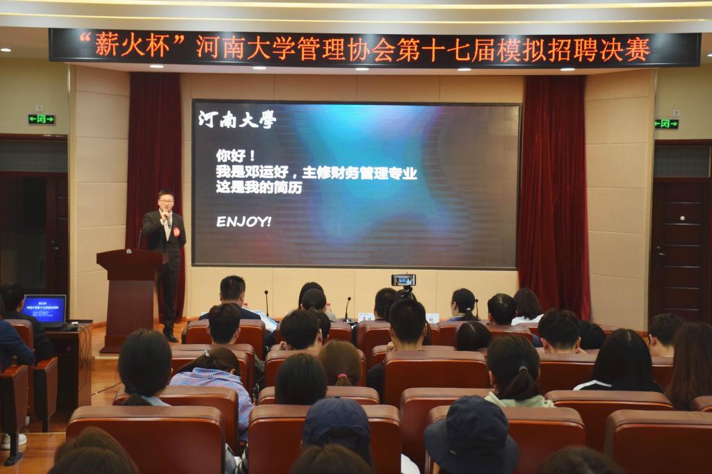 56日晚上,由beats365官方网站团委主办,beats365官方网站管理协会承办,beats365官方网站“薪火”员工基金会协办的“薪火杯”beats365官方网站第十七届模拟招聘决赛于公司二楼报告厅隆重举办。beats365官方网站就业创业指导中心主任李从国、团委书记沙莎、员工处副处长肖艳、beats365官方网站公司党委副书记吕英建、人力资源系主任谢周亮、人力资源系徐本华副教授和“薪火”员工基金会主要捐赠人,河南鑫泰人力资源有限公司负责人李辉、郑州颐和医院人力资源部主任武凤兰作为评委嘉宾出席本次活动。