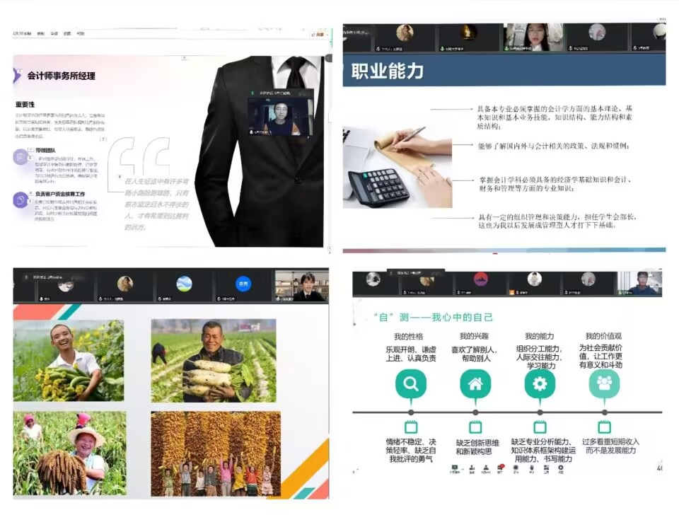 本次比赛包含个人职业生涯规划书展示和PPT汇报两个部分,选手们围绕自我认知、职业认知、职业决策、职业计划路径、评估调整等步骤,运用SWOT分析和霍兰德职业兴趣测试等理论,撰写个人职业生涯规划书并进行线上汇报。各参赛选手结合自己目前实际情况,着重介绍自我如何制定并调整目标,以及在老员工活和毕业后几年的人生规划。各参赛人员逻辑清晰、沉着冷静的畅谈自己的职业生涯规划。2020级的朱望宇讲到,作为一个农村长大的孩子,我深知农产品对于农民生存发展的重要性。在当下社会,国潮兴起,国产品牌得到了更多的关注,我开始思考是否农产品品牌也能够乘上这样的东风,因而我将我的职业生涯规划目标设定为助力于农产品品牌推广的营销策划者。