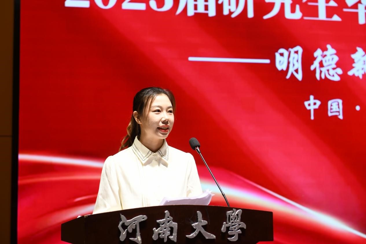 2022级何文静作为在校生代表发言。她代表全体在校生向毕业生们献上诚挚的祝愿,祝贺他们学业有成,祝愿他们一帆风顺,前程似锦,自信征途。