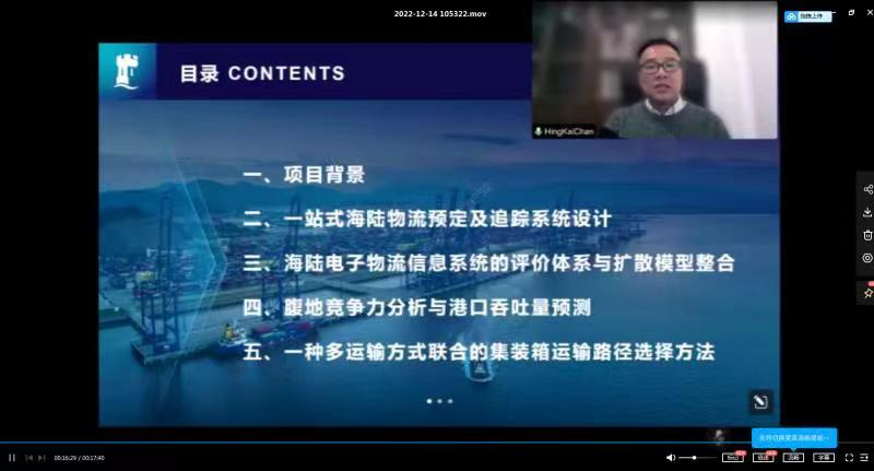 报告内容主要包括海陆供应链整合、海陆电子物流信息系统的评价体系与扩散模型整合、港口管理运营优化三个部分。陈庆佳教授从一站式海陆物流预定及追踪系统设计讲起,重点介绍了订舱平台模式与传统海运订舱模式的不同,从科技、组织、环境因素三个角度分析了影响企业采用电子预定追踪系统的因素以及该平台构建过程中由于信息或数据不完整引发的问题等内容。随后,陈教授讲解了海陆联电子物流信息系统的价值创造机制,分析了区块链等新型技术在海运供应链中的应用,总结了五种基于区块链技术的创新商业模式及其价值创造机制、价值捕捉机制和管理挑战。最后,陈教授详细讲解了港口吞吐量预测模型——SARIMA和SVR混合时间序列预测模型。