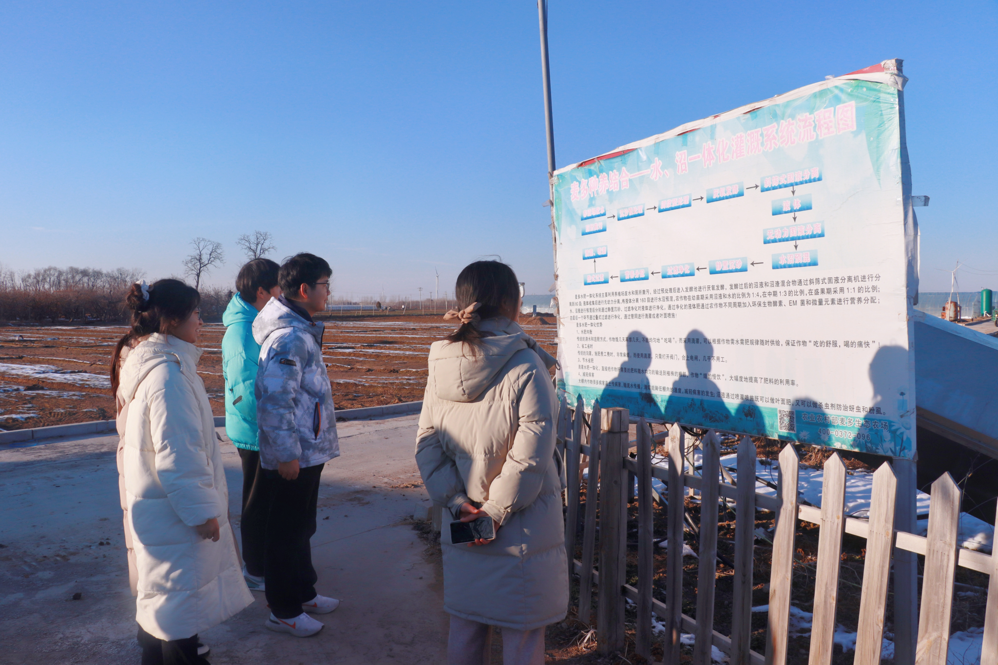 1月23日,实践调研团队首先前往河南省安阳市汤阴县,走进五陵镇麦多有机产业基地这一“国家级生态农场”。实践调研团队跟随企业负责人的脚步,参观了农场的蔬菜大棚、育苗温室以及立方沼气工程等。在企业负责人的介绍中,团队成员深入了解了农场采用的沼渣沼液无土栽培技术以及BOO生态循环模式的运行原理。团队成员深刻认识到生态循环模式不仅促进农业增产增收,还促进不同产业之间协调发展能力,实现经济效益和环保治理双赢。同时,农业发展也离不开科技的力量,要通过科技创新促进农业转型。