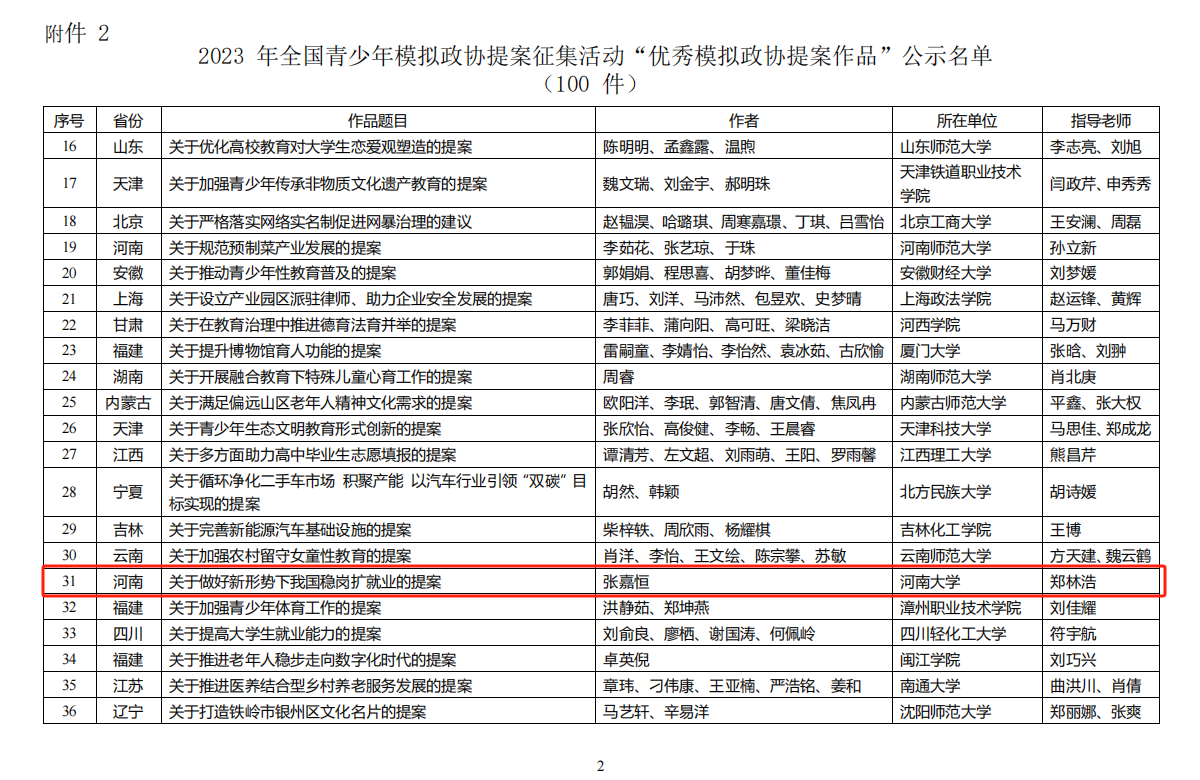 近日,由共青团中央维护青少年权益部、全国学联秘书处联合开展的2023年全国青少年模拟政协提案征集活动评审结果公布,共评选出100件“最佳模拟政协提案作品”和100件“优秀模拟政协提案作品”。公司辅导员郑林浩指导、本科生张嘉恒提交的《关于做好新形势下我国稳岗扩就业的提案》,从全国875件模拟提案作品中脱颖而出,获评“优秀模拟政协提案作品”奖项。