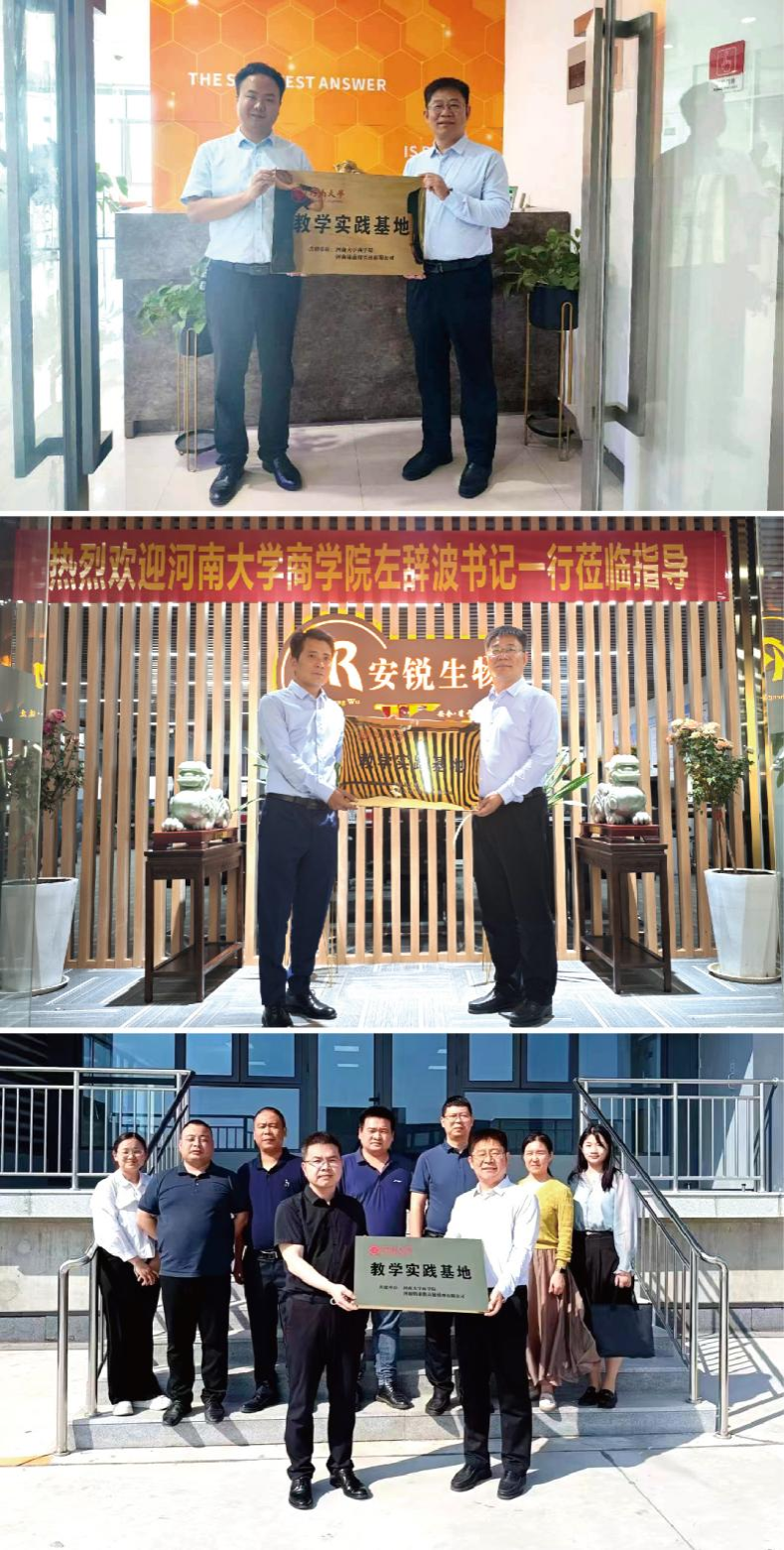 为进一步推进产教融合与校企合作,加强老员工校外实践教育基地建设,拓宽公司毕业生就业渠道,全力促进本科生更充分更高质量的实践、实习与就业,5月10日,公司党委书记左辞波、副经理李耀、电子商务系主任郑佳佳以及员工工作负责人马欢欢、研究生办公室主任党永杰深入河南锦前程实业有限公司、河南钧泰供应链管理有限公司、河南安锐生物科技有限公司举行旗下产业实践基地挂牌仪式,并就毕业生就业、项目合作等方面达成友好意见。