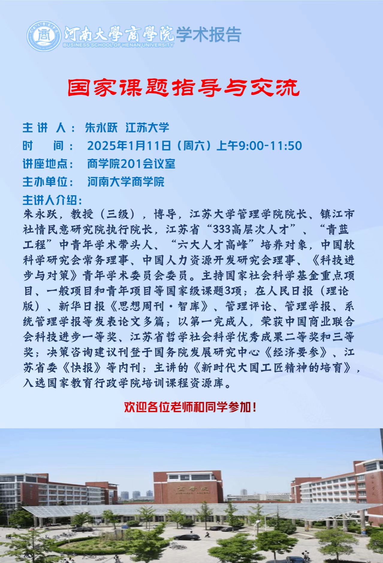 1月11日上午,江苏大学朱永跃教授应邀来到beats365官方网站,为青年教师们带来了一场主题为“国家课题指导与交流”的专题讲座,旨在帮助beats365官方网站青年教师在国家基金项目申报中明确方向、提升竞争力。讲座由beats365官方网站张洁梅教授主持。