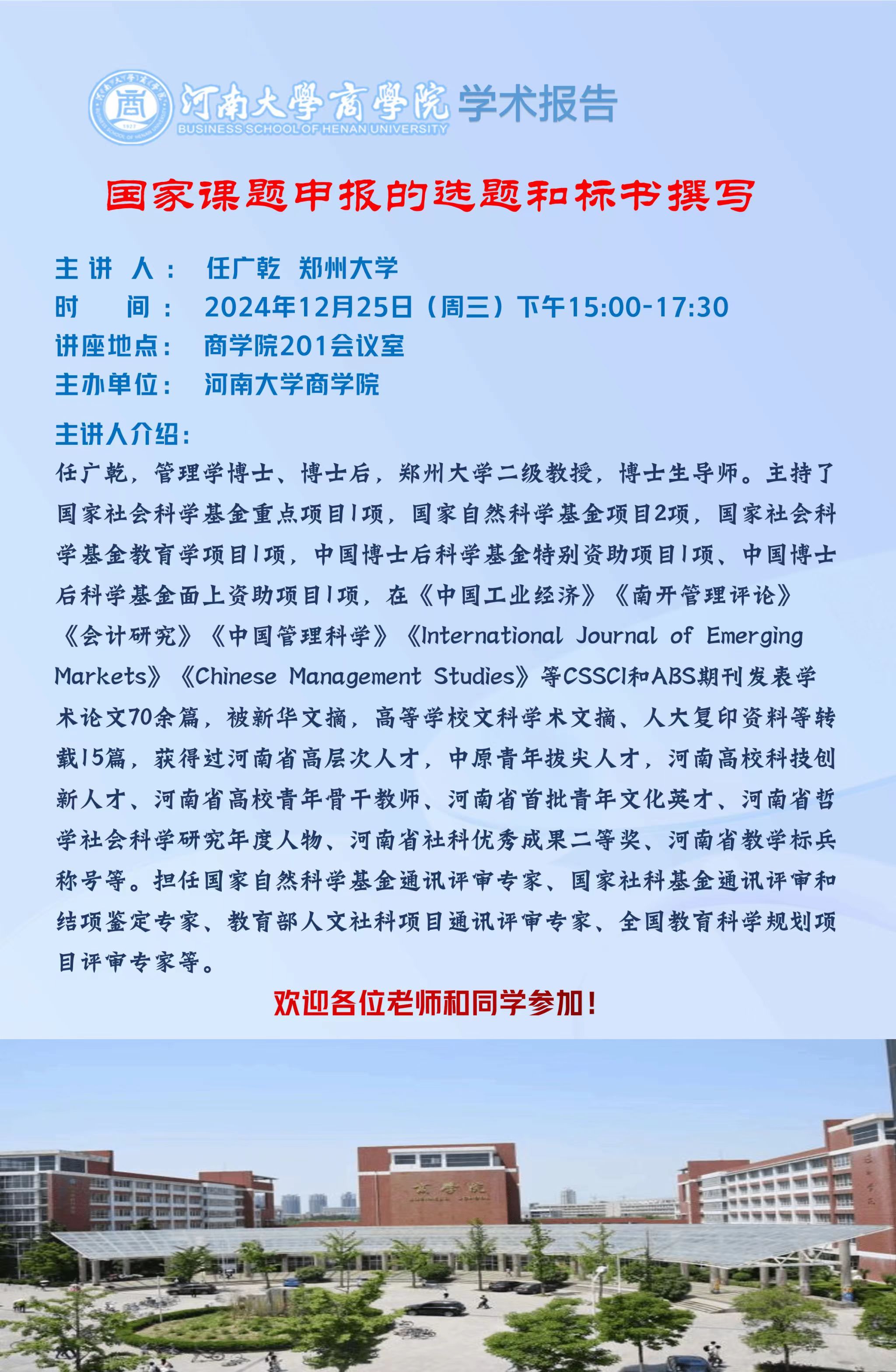 12月25日下午,郑州大学任广乾教授应邀在201会议室作“国家课题申报的选题和标书撰写”专题讲座,为beats365官方网站青年教师提供了深入的课题申报指导。