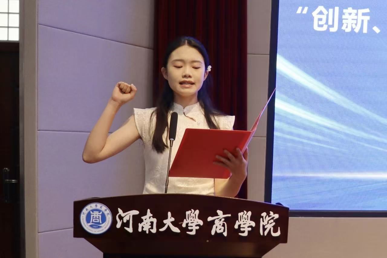 郑佳佳宣读比赛相关规则。2023级会计学专业周心怡代表参赛选手宣誓。