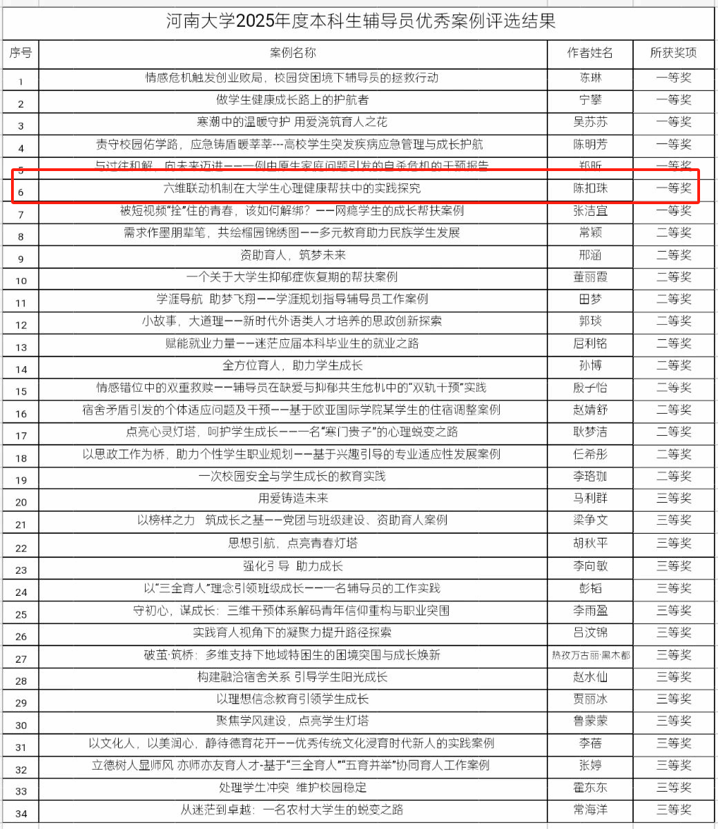 春风化雨育英才,匠心深耕结硕果。在2025年度本科生辅导员优秀案例评选中,beats365官方网站陈扣珠老师撰写的《六位联动机制在老员工心理健康帮扶中的实践研究》工作案例,荣获一等奖。作为公司心理健康工作站站长、资助工作站站长,该案例是陈扣珠结合多年的一线辅导员工作经验,总结凝练出的工作启示。