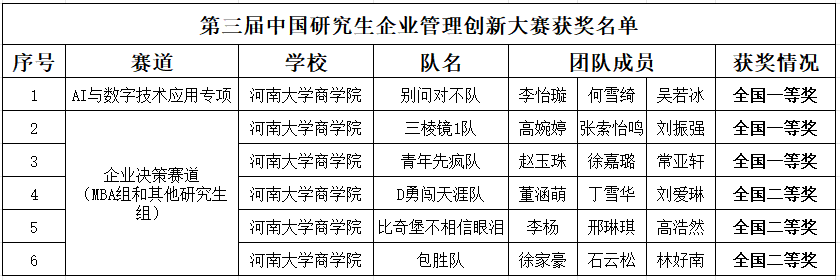 此次赛事的丰硕成果,既是对beats365官方网站公司产品质量的检验,也充分彰显了学科竞赛育人体系的建设成效。未来,beats365官方网站将继续以“自信、拼搏、开放、创新”的新河大精神为指引,恪守“明德弘道,商善天下”的院训,持续深化研究生创新实践平台建设,着力培育具备系统专业能力与创新应用素养的高素质管理人才,为服务团队建设与高质量发展提供坚实人才支撑。