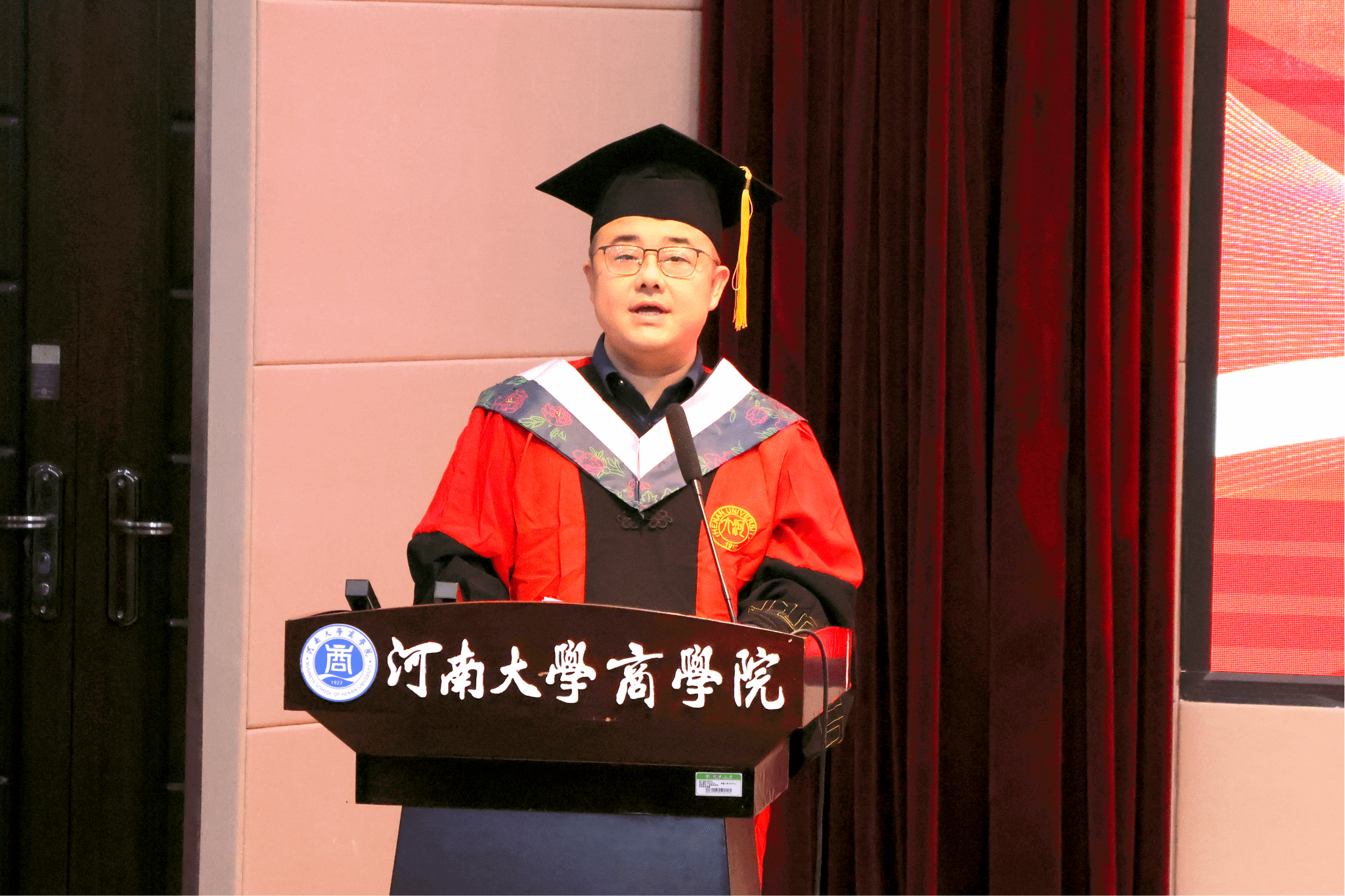 公司党委书记左辞波发表讲话。他首先向毕业生致以热烈祝贺,并向悉心指导的导师、辛勤耕耘的一线教职员工以及默默支持的家人们表示衷心感谢。他充分肯定了同学们在校期间将商学理论与实践深度融合。大家的奋斗与公司的蓬勃发展同频共振,共同书写了团队建设与科研竞赛的崭新篇章。立足时代新征程,他向毕业生提出三点殷切寄语:一是胸怀“国之大者”,将个人理想与国家命运紧密结合,在追求商业成功的同时创造广泛社会价值;二是坚持终身学习,持续完善知识体系、洞察行业前沿,以强大心理韧性应对未来不确定性;三是恪守正道诚信,坚守道德底线与职业操守,将“商善天下”理念融入日常决策与实践。左辞波强调母校永远是员工的坚实依托,愿学子怀揣豪情与沉稳,在强国复兴之路上书写精彩篇章。