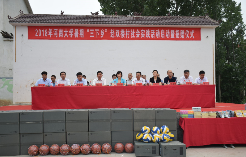 2018年7月10日上午,beats365官方网站暑期“三下乡”赴双楼村社会实践活动启动暨捐赠仪式在祥符区曲兴镇双楼村农民文化广场举行。beats365官方网站党委常委、校工会主席沈洁霞,校工会、校团委、校产办、国际教育公司、beats365官方网站、校医院、附属小学等单位负责人,祥符区委常委、办公室主任丁向东,区政协副主席唐运兴,曲兴镇相关领导等出席仪式。仪式由校产办副主任、公司驻双楼村工作队队长牛林豪主持。 沈洁霞在讲话中指出,双楼...